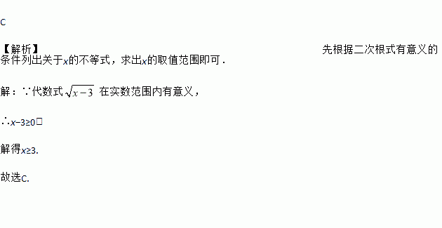 C 【解析】先根据二次根式有意义的条件列出关于x的不等式,求出x的取值范围即可. 【解析】 ∵代数式在实数范围内有意义, ∴x?3≥0, 解得x≥3. 故选C.