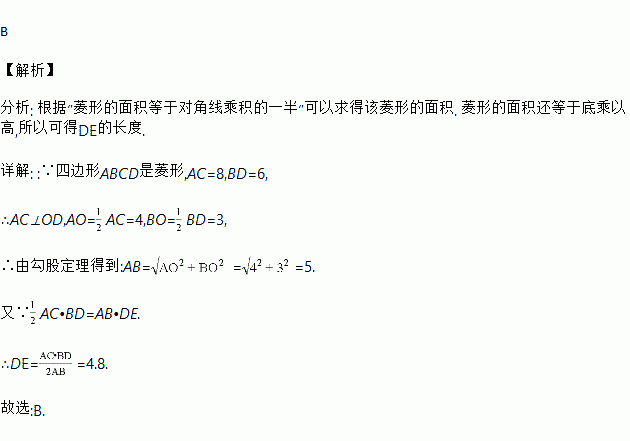 如图,菱形ABCD的两条对角线相交于点O,若AC=8,BD=6,过点D作DE⊥AB,垂足为E,则DE的长是( )