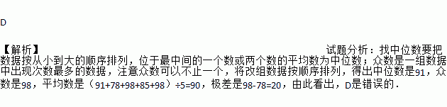 A. 极差是20 B. 中位数是91 C. 众数是98 D. 平均数是91