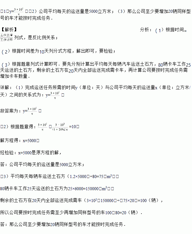 (1)写出完成运送任务所需的时间y(单位:天)与公司平均每天的运送量x(单位:立方米/天)之间的关系式是 ;
