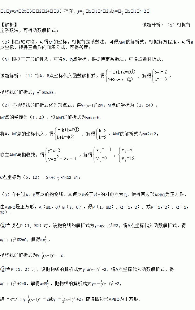 (3)是否存在过A,B两点的抛物线,其顶点P关于x轴的对称点为Q,使得四边形APBQ为正方形?若存在,求出此抛物线的解析式;若不存在,请说明理由.