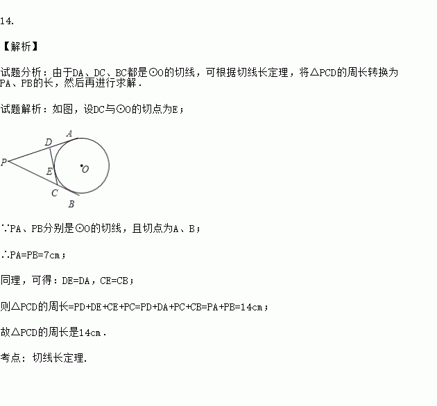 Èçͼ£¬PA¡¢PB·Ö±ðÇÐÔ²OÓÚA¡¢BÁ½µã£¬²¢ÓëÔ²OµÄÇÐÏß·Ö±ðÏཻÓÚC¡¢DÁ½µã£¬ÒÑÖªPA=7cm£¬Ôò¡÷PCDµÄÖܳ¤µÈÓÚ_________£®