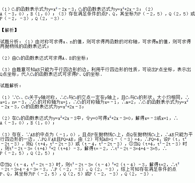 (3)在抛物线C1上是否存在一点P,在抛物线C2上是否存在一点Q,使得以AB为边,且以A、B、P、Q四点为顶点的四边形是平行四边形?若存在,求出P、Q两点的坐标;若不存在,请说明理由.