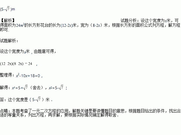 在一块长12m,宽8m的长方形平地中央,划出地方砌一个面积为24m2的长方形花台,要使花坛四周的宽地宽度一样,则这个宽度为多少?