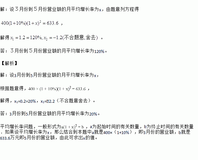 某商场今年2月份的营业额为400万元,3月份的营业额比2月份增加10%,5月份的营业额达到633.6万元.求3月份到5月份营业额的月平均增长率.