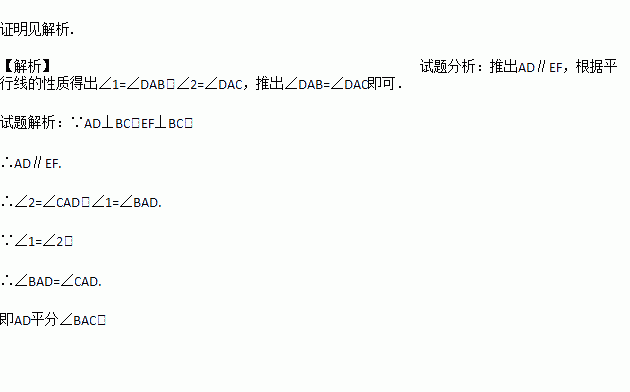 已知:如图,AD⊥BC于D,EF⊥BC于F,交AB于G,交CA延长线于E,∠1=∠2.试说明:AD平分∠BAC.