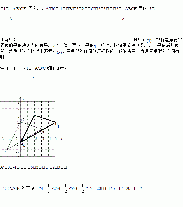 (1)△ABC中任意一点M(a,b)经过平移后的对应点为M′(a+2,b+1),将△ABC作同样的平移,得到△A′B′C′,写出A′、B′、C′的坐标,并在图中画出平移后图形.