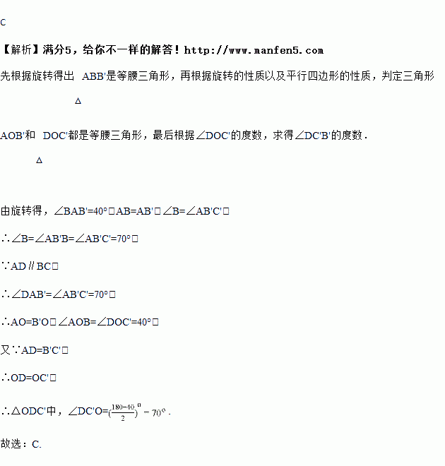 如图,将平行四边形ABCD绕点A逆时针旋转40°,得到平行四边形AB′C′D′,若点B′恰好落在BC边上,则∠DC′B′的度数为( )
