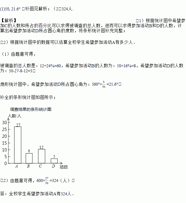 (1)如图,希望参加活动C占24%,希望参加活动D占16%,则被调查的总人数为_______人,扇形统计图中,希望参加活动D所占圆心角为_________度,根据图中信息补全条形统计图;