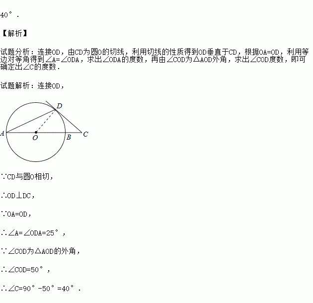 如图,AB是⊙O的直径,点C在AB的延长线上,CD切⊙O于点D,连接AD.若∠A=25°,则∠C= 度.