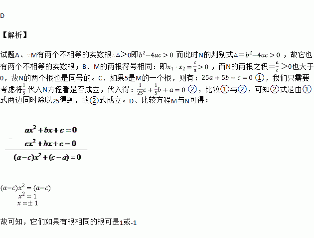 A. 如果方程M有两个相等的实数根,那么方程N也有两个相等的实数根