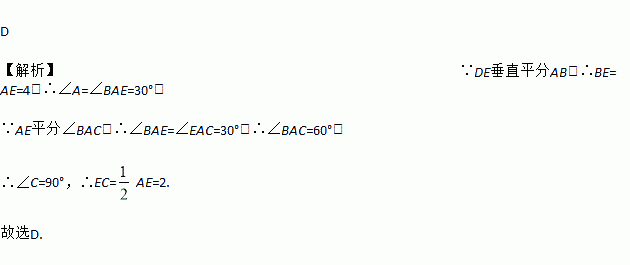 D 【解析】∵DE垂直平分AB,∴BE=AE=4,∴∠A=∠BAE=30°, ∵AE平分∠BAC,∴∠BAE=∠EAC=30°,∴∠BAC=60°, ∴∠C=90°,∴EC=AE=2. 故选D.