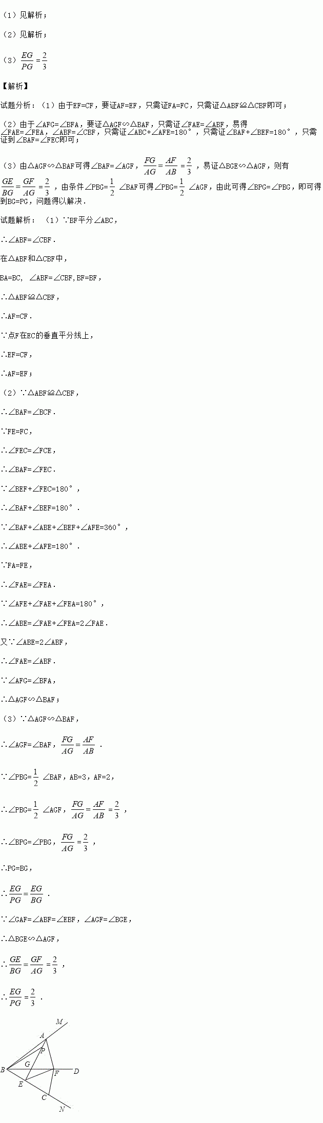 如图,射线BD是∠MBN的平分线,点A、C分别是角的两边BM、BN上两点,且AB=BC,E是线段BC上一点,线段EC的垂直平分线交射线BD于点F,连结AE交BD于点G,连结AF、EF、FC.