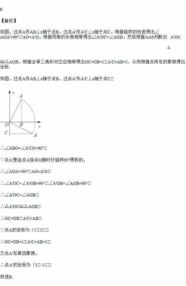 在平面直角坐标系中,点A的坐标是(1,3),将点A绕原点O顺时针旋转90°得到点A′,则点A′的坐标是( )