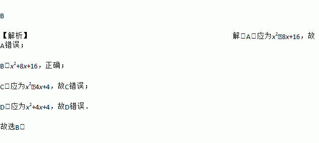 B 【解析】解:A.应为x2﹣8x+16,故A错误; B.x2+8x+16,正确; C.应为x2﹣4x+4,故C错误; D.应为x2+4x+4,故D错误. 故选B.
