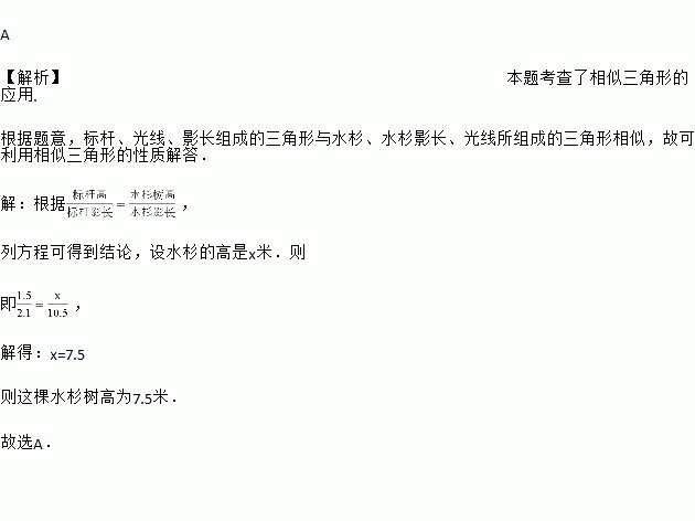 一根1.5米长的标杆直立在水平地面上,它在阳光下的影长为2.1米,此时一棵水衫树的影长为10.5米,这棵水衫树高为( )