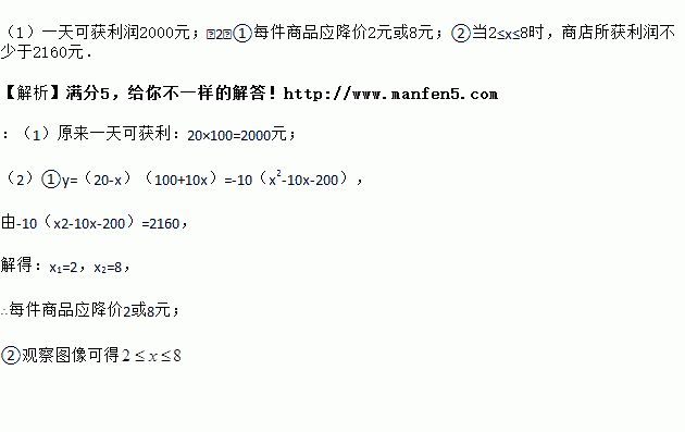 ①若商场经营该商品一天要获利润2160元,则每件商品应降价多少元?