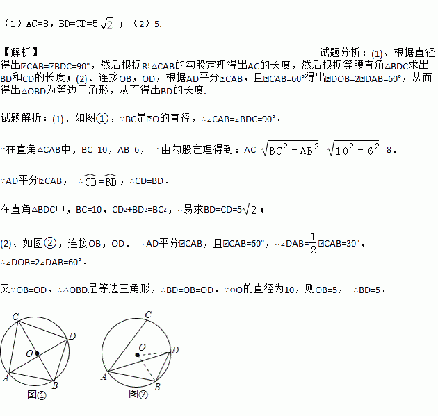 (1)如图①,若BC为⊙O的直径,AB=6,求AC,BD,CD的长;