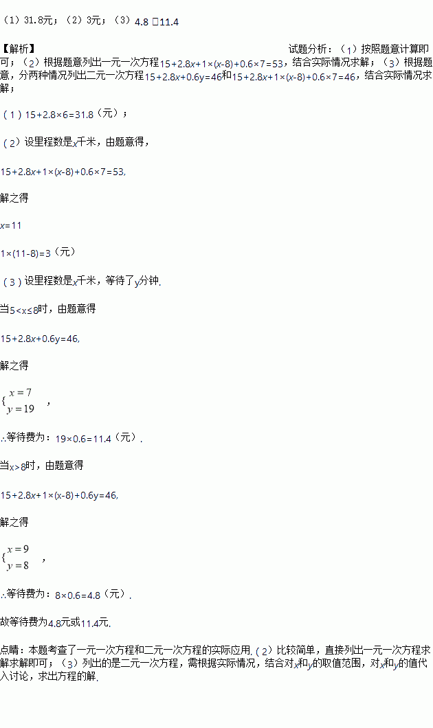(3)某次行程结束后,乘客小周发现乘车的里程数超过了5公里,需要支付的费用恰好为46元,起初小周认为系统计算错误,经司机提醒才记起,原来是他有事耽搁没有及时上车,被收取了等待费,则收取的等待费为 元.(直接在横线上写出答案)