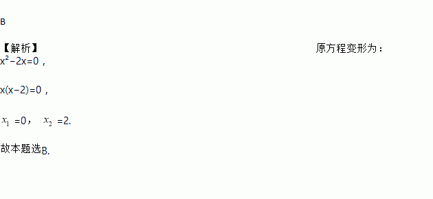 B 【解析】原方程变形为:x²?2x=0, x(x?2)=0, =0, =2. 故本题选B.