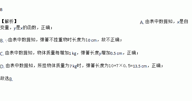 弹簧挂上物体后会伸长,测得一根弹簧的长度y(cm)与所挂物体的质量x(kg)间有下面的关系: