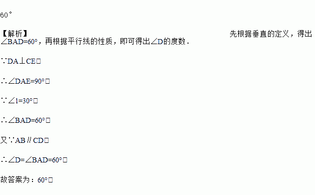 如图,DA⊥CE于点A,CD∥AB,∠1=30°,则∠D=_____.
