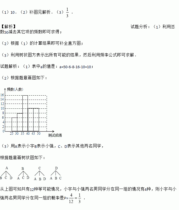(1)10.(2)补图见解析.(3). 【解析】试题分析:(1)利用总数50减去其它项的频数即可求得; (2)根据(1)的计算结果即可补全直方图; (3)利用树状图方表示出所有可能的结果,然后利用频率公式即可求解. 试题解析:(1)表中a的值是:a=50-6-8-16-10=10; (2)根据题意画图如下: (3)用A表示小宇B表示小强,C、D表示其他两名同学,...