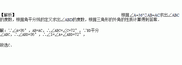 如图,等腰三角形ABC中,AB=AC,BD平分∠ABC,∠A=36°,则∠1的度数为( )