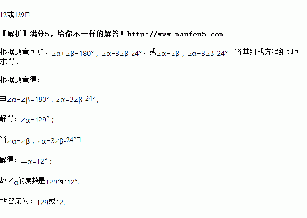 如果∠α与∠β的两边分别平行,∠α比∠β的三倍少24°,则∠α的度数是_____度.