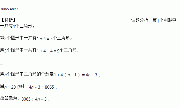 观察图形,第一个图形中有一个三角形;第二个图形中有5个三角形;第三个图形中有9个三角形;…则第2017个图形中有_____个三角形,第n个图形中有_____个三角形.
