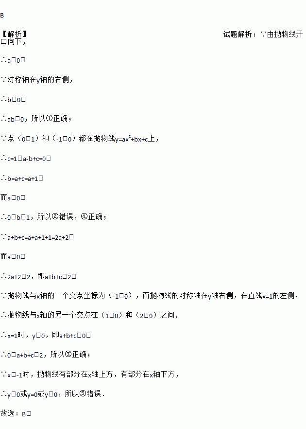 如图,二次函数y=ax2+bx+c(a≠0)的图象的顶点在第一象限,且过点(0,1)和(﹣1,0),下列结论:①ab<0,②b2>4,③0<a+b+c<2,④0<b<1,⑤当x>﹣1时,y>0.其中正确结论的个数是( )