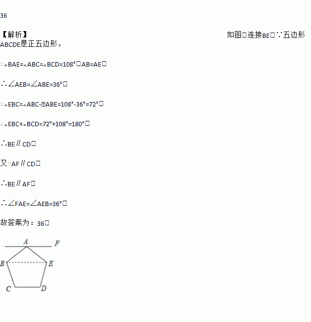如图,过正五边形ABCDE的顶点A作直线AF∥CD,则∠EAF的度数为_____°.