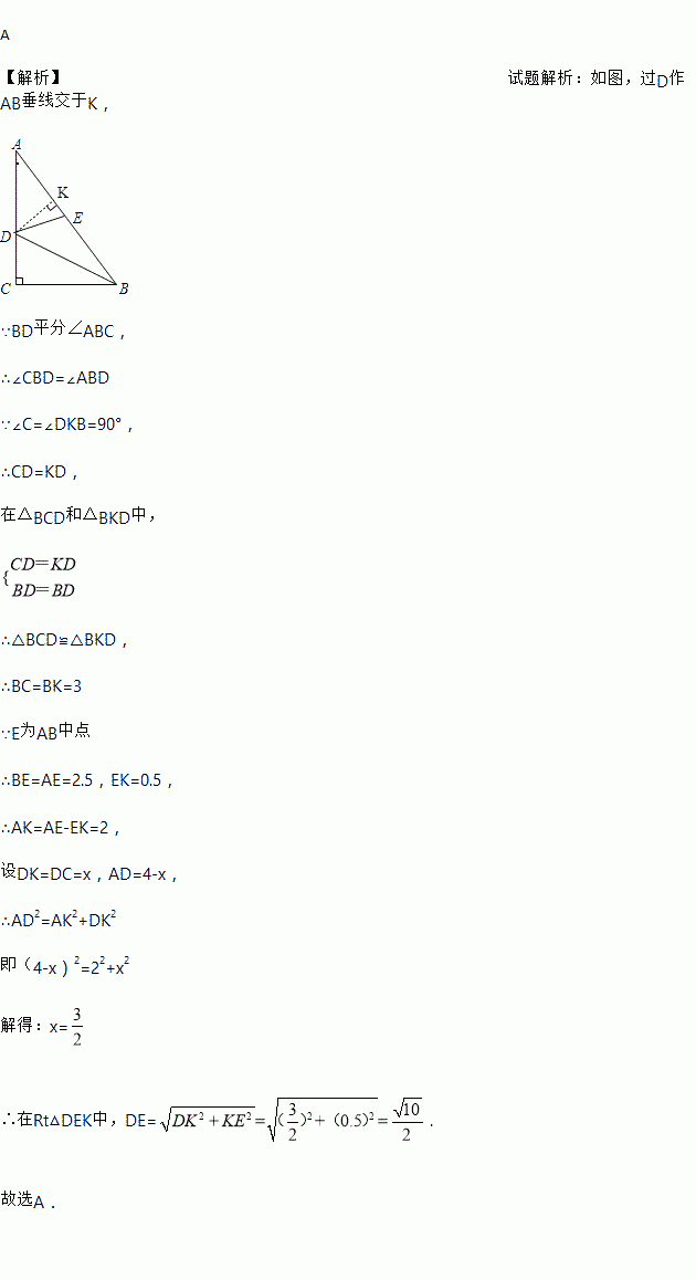 如图,在Rt△ABC中,∠C=90°,AC=4,BC=3,BD平分∠ABC,E是AB中点,连接DE,则DE的长为( )