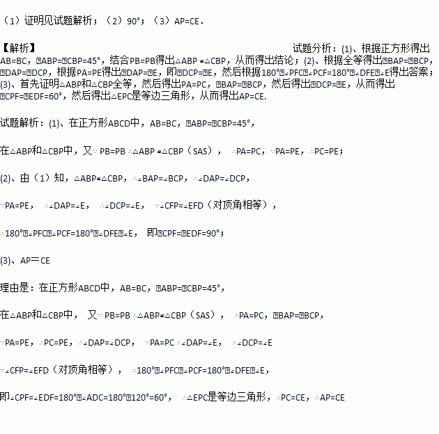 (3)如图2,把正方形ABCD改为菱形ABCD,其他条件不变,当∠ABC=120度时,连接CE,试探究线段AP与线段CE的数量关系,并说明理由.