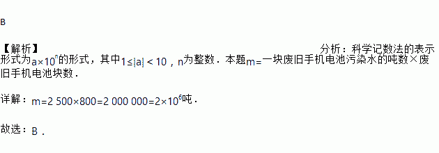 据报道一块废旧手机电池可以使800吨水受到污染,某校三年来发动全体同学共回收废旧手机电池2500块.若这2500块废旧电池可以使m吨水受到污染,用科学记数法表示m=( )
