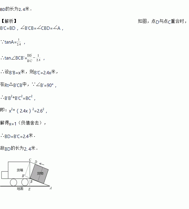 如图,是将一正方体货物沿坡面AB装进汽车货厢的平面示意图,已知长方体货厢的高度BC为2.6米,斜坡AB的坡比为1:2.4,现把图中的货物继续向前平移,当货物顶点D与C重合时,仍可把货物放平装进货厢,则货物的高度BD不能超过_____米.