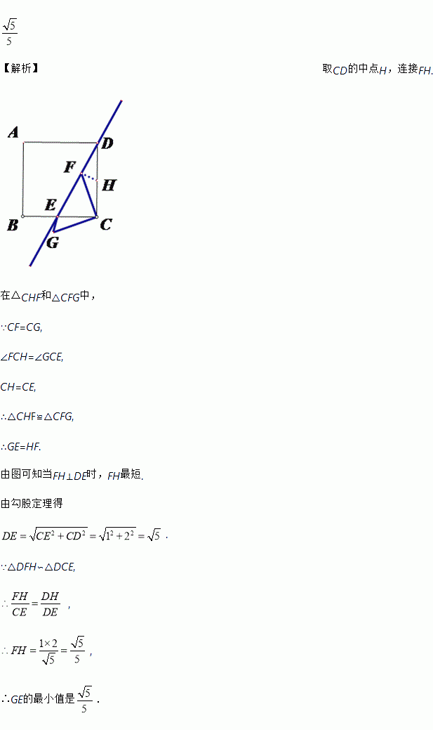 如图,四边形是边长为的正方形, 是边的中点, 是直线上的动点.连接,将线段逆时针旋转得到,连接,则的最小值是__________.