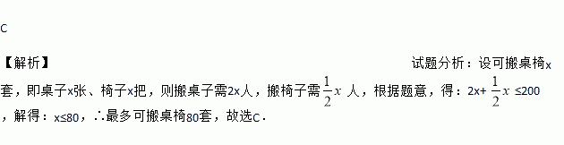(2016四川省雅安市)“一方有难,八方支援”,雅安芦山420地震后,某单位为一中学捐赠了一批新桌椅,学校组织初一年级200名学生搬桌椅.规定一人一次搬两把椅子,两人一次搬一张桌子,每人限搬一次,最多可搬桌椅(一桌一椅为一套)的套数为( )