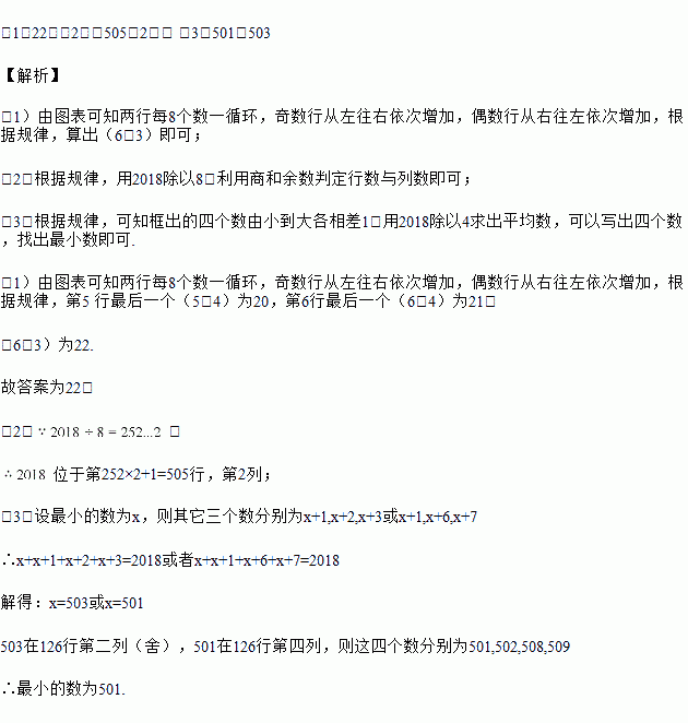 (3)用一个正方形方框在第3列和第4列中任意框四个数,这四个数的和能为2018吗?如果能,求出框出的四个数中最小的数;如果不能,请写出理由。