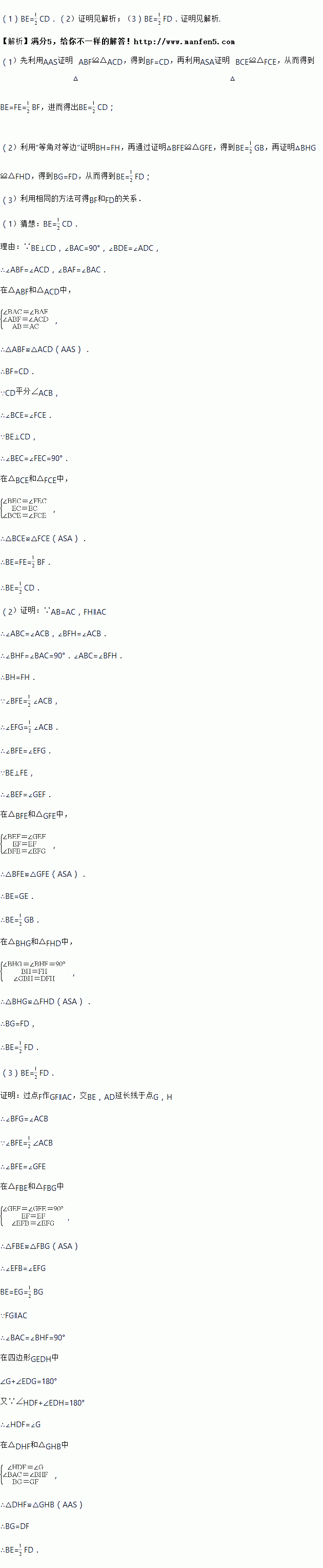 (1)如图(1),CD平分∠ACB交AB于点D,BE⊥CD于点E,延长BE、CA相交于点F,请猜想线段BE与CD的数量关系,并说明理由.