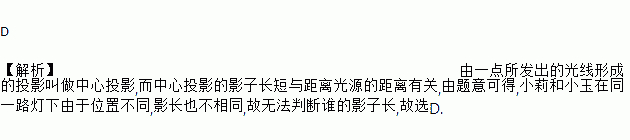 D 【解析】由一点所发出的光线形成的投影叫做中心投影,而中心投影的影子长短与距离光源的距离有关,由题意可得,小莉和小玉在同一路灯下由于位置不同,影长也不相同,故无法判断谁的影子长,故选D.