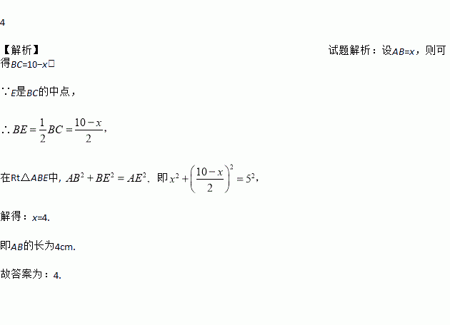 如图,矩形ABCD中,E是BC的中点,矩形ABCD的周长是20 cm,AE=5 cm,则AB的长为________ cm.