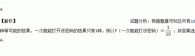某个密码锁的密码由三个数字组成,每个数字都是0-9这十个数字中的一个,只有当三个数字与所设定的密码及顺序完全相同,才能将锁打开,如果仅忘记了所设密码的最后那个数字,那么一次就能打开该密码的概率是( )