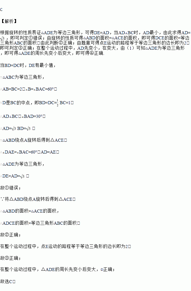 如图,在等边三角形ABC中,AB=2,动点D从B开始沿BC向点C运动,到达点C后停止运动,将△ABD绕点A旋转后得到△ACE,则下列说法中,正确的是( )