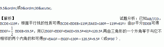 如图,AB//CD,∠CDE=119º,GF交∠DEB的平分线EF于F,∠AGF=130º,则∠F= 。