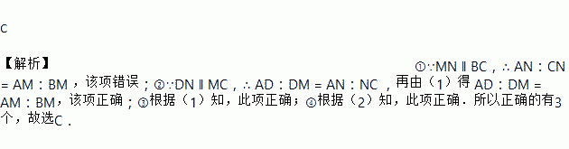 如图,在△ABC中,已知MN∥BC,DN∥MC.以下四个结论:①;②;③;④. 其中正确结论的个数为( )