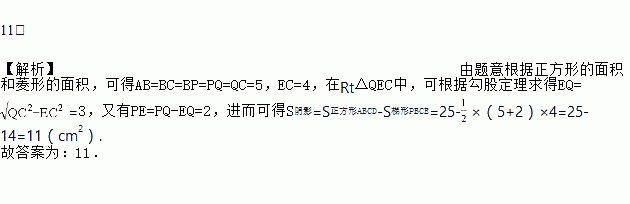 如图所示,正方形ABCD与菱形PQCD的面积分别为25cm2和20cm2,阴影部分的面积为_____cm2.