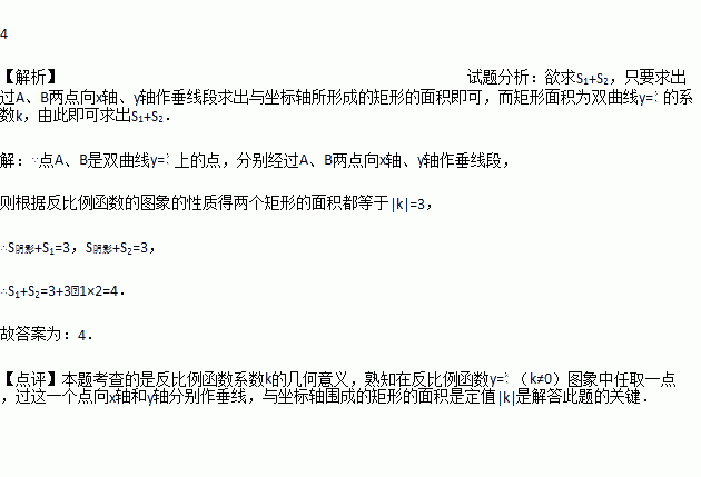 如图,点A、B 是双曲线y=上的两点,分别过A、B两点向x轴,y轴作垂线段,若S阴影=1,则S1+S2=___________.
