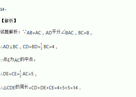 如图,△ABC中,AB=AC=10,BC=8,AD平分∠BAC交BC于点D,点E为AC的中点,连接DE,则△CDE的周长为 .