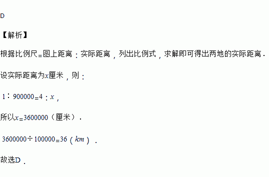 在比例尺为1∶900000的安徽黄山交通图中,黄山风景区与市政府所在地之间的距离是4 cm,这两地的实际距离是( )